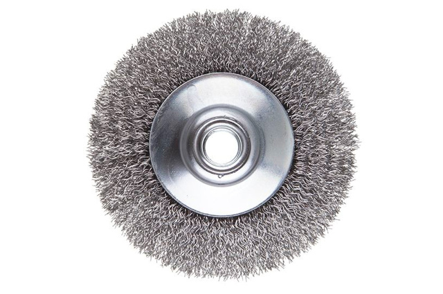 Щетка конусная с рифленной проволокой для УШМ. Предназначена для работ по дереву, бетону, металлу и лакокрасочным покрытиям. Диаметр 100 мм. Толщина проволоки 0,3 мм. Скорость вращения: 12500 об/мин. Тип проволоки: рифленная проволока; Скорость вращения: 12500 об/мин; Диаметр щетки: 100 мм; Диаметр проволоки: 0,3 мм; Держатель: М14; Применение: для дерева, бетона, металла и лакокрасочных покрытий