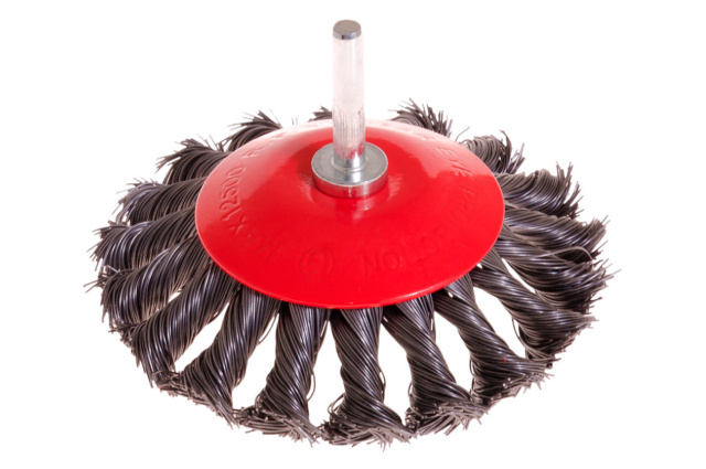 Щетка конусная с плетеной проволокой для дрели. Предназначена для работ по дереву, бетону, металлу и лакокрасочным покрытиям. Диаметр щетки 100 мм, стержня - 6 мм. Скорость вращения: 4500 об/мин