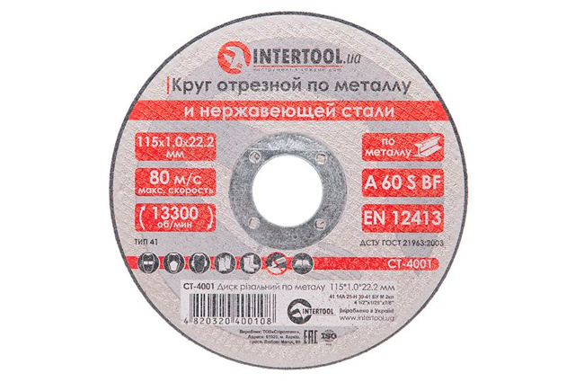 Круг отрезной по металлу Intertool. Максимальная скорость 80 м/с. Максимальное количество оборотов 13300 об/мин. Абразивный материал - оксид алюминия на бакелитовой связке. Применяется для работы с углеродистой сталью. Диаметр круга: 115 мм; Толщина круга: 1 мм; Диаметр посадочного отверстия: 22,2 мм