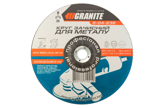 Диск зачистной по металлу "Granite" предназначен для использования в качестве расходного материала к УШМ для шлифовки металла. Армированый. Абразивный материал - оксид алюминия, связка - бакелитовая. Размеры диска 230 x 6,0 x 22 мм.