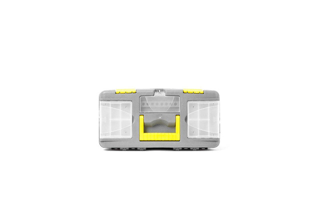 Ящик для инструмента практичен и удобен в использовании. На крышке расположены два отдельных съемных органайзера с разнообразными ячейками, которые отлично подойдут для хранения метизов или любой другой мелочи. Там же расположен отдел для хранения отверточных насадок, который закрывается прозрачной крышкой. Габаритные размеры: 355х182х153 мм