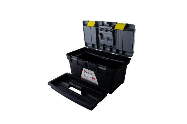 Ящик для инструмента практичен и удобен в использовании. На крышке расположены два отдельных съемных органайзера с разнообразными ячейками, которые отлично подойдут для хранения метизов или любой другой мелочи. Там же расположен отдел для хранения отверточных насадок, который закрывается прозрачной крышкой. Габаритные размеры: 536х292х271 мм