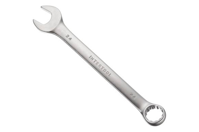 Ключ комбинированный. Это качественное сочетание двух наиболее распространенных видов ключей - гаечного и рожкового. Обе головки имеют одинаковый размер. Ключ изготавливается из легированного хромванадиевого сплава, что обеспечивает высокие эксплуатационные характеристики. Сатин-хромовое покрытие надежно защищает инструмент от коррозии. Размер ключа: 24 мм