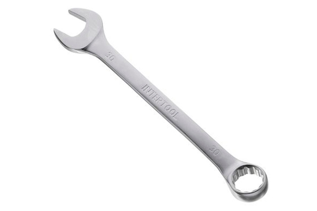 Ключ комбинированный. Это качественное сочетание двух наиболее распространенных видов ключей - гаечного и рожкового. Обе головки имеют одинаковый размер. Ключ изготавливается из легированного хромванадиевого сплава, что обеспечивает высокие эксплуатационные характеристики. Сатин-хромовое покрытие надежно защищает инструмент от коррозии. Размер ключа: 30 мм