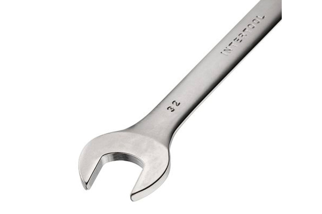 Ключ комбинированный. Это качественное сочетание двух наиболее распространенных видов ключей - гаечного и рожкового. Обе головки имеют одинаковый размер. Ключ изготавливается из легированного хромванадиевого сплава, что обеспечивает высокие эксплуатационные характеристики. Сатин-хромовое покрытие надежно защищает инструмент от коррозии. Размер ключа: 32 мм