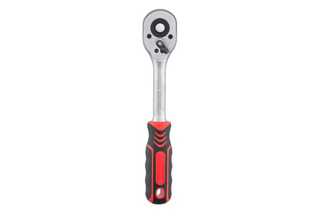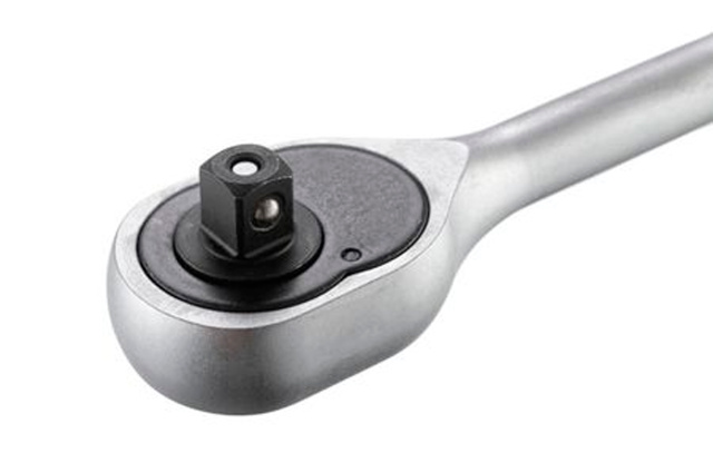 Рукоятка с храповым механизмом (трещотка) на 45 зубов. Рукоятка подходит для головок с квадратом в 3/8". Рукоятка предназначена для работы с гайками и болтами. Без особых усилий, прилагаемых на рукоятку вы можете как откручивать, так и закручивать гайки и болты. Эргономичная двухкомпонентная рукоятка, приятна на ощупь. Хромванадиевая сталь рукоятки обеспечивает изделию прочность, износостойкость. долговечность. Если вы еще пользуетесь гаечными ключами, то пора задуматься и над покупкой трещотки. Естественно, что к трещотке еще нужно приобрести головки нужного размера. А еще лучше, купить набор инструментов, в котором есть и трещотки, и головки. Выбор головок стал еще более простым и удобным. При нажатии на металлическую кнопку, находящуюся в верхнем основании рукоятки, вы с легкостью снимаете головку с гнезда. Подробнее о рукоятках с храповым механизмом Квадрат: 3/8"