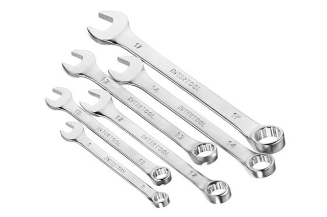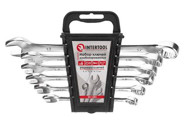 Набор из шести рожково-накидных ключей. Размерная линейка: 8, 10, 12, 13, 14 и 17 мм. Ключи поставляются в удобном пластиковом держателе с отверстием для подвешивания. Хром-ванадиевая сталь. Количество ключей в наборе: 6 ед.; Размеры: 8-17 мм