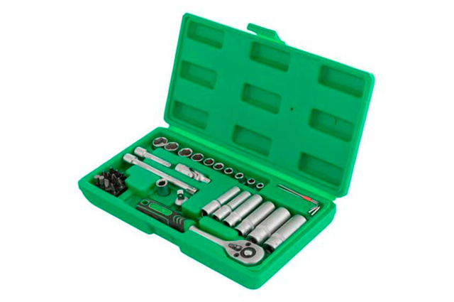 Набор включает в себя 36 единиц и укомплектован в эргономичный кейс из пластика. В состав данного набора входит 10 торцевых головок диаметром от 4 до 13 мм, 2 головки для свечей зажигания, 1 ключ с трещоткой, 3 шестигранных Г-образных ключа, карданчик и переходники. Используемый размер квадрата - 1/4". Инструменты изготовлены из хром-ванадиевой стали. Габаритные размеры: 230х120х40 мм; Квадрат: 1/4"; Количество единиц в наборе: 36 ед.; Материал чемодана: пластик
