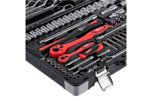 Набор включает в себя 16 комбинированных гаечных ключей диаметрами 6-27 мм, 10 торцевых головок с рабочим квадратом 1/4" (4-13 мм) и 18 торцевых головок с рабочим квадратом 1/2" (10-32 мм). Кроме того есть 10 головок "звезд" (Е10, Е11, Е12, Е14, Е16, Е18, Е20, Е22). Также в наличии 2 рукоятки с храповым механизмом (трещотки) на 72 зубца с рабочими квадратами 1/2" и 1/4" и возможностью сброса и фиксации торцевых головок. Эти рукоятки полностью покрыты защитным слоем из полипропилена, что исключает возможность появления коррозии. Они предназначены для закручивания и откручивания крепежных элементов. Помимо этого в набор вошли два удлинителя с рабочими квадратами 1/2" и 1/4" - они позволяют работать с крепежом, расположенным в самых труднодоступных местах; инструмент для зачистки проводов; молоток весом 300 г; четыре отвертки с огромным количеством насадок и бит, а также плоскогубцы и клещи. Габаритные размеры: 520х364х95 мм; Размер рожково-накидных ключей: 6-27 мм; Квадрат: 1/2"1/4"; Количество единиц в наборе: 119 ед.; Материал чемодана: пластик