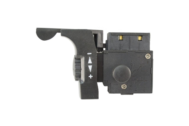Кнопка включения для дрели DWT с узким реверсом. Переключатель реверса. Электронная регулировка оборотов от нажатия на педаль включателя или колесом регулятора. Боковая кнопка фиксатор для длительного включения. Крепление сетевых проводов - винтами, остальные - быстрозажимными фиксаторами.
