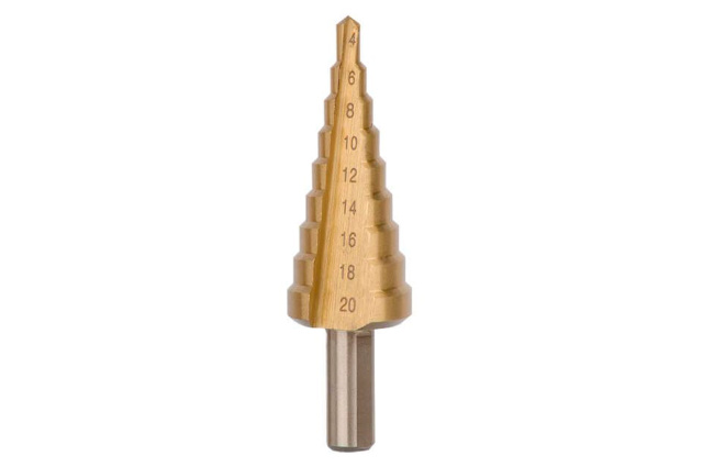 Ступенчатое (шаговое) сверло – отличный помощник для деликатного сверления отверстий большого диаметра в листовых металлах и пластике. Ступенчатая структура позволяет сверлить отверстия разного диаметра (4-20 мм), без замены режущего инструмента. Цилиндрический хвостовик позволяет устанавливать сверло в дрель, шуруповерт или сверлильный станок. Шаг: 2 мм; Максимальная глубина сверления: 4 мм; Хвостовик: цилиндрический 8 мм; Количество ступеней: 9; Диаметр сверла: 4, 6, 8, 10, 12, 14, 16, 18, 20 мм