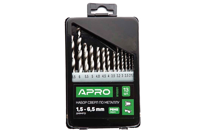 Набор сверл по металлу Apro - предназначен для сверления отверстий в металлических материалах, включая сталь, чугун, алюминий и другие сплавы. Имеет специальную спиральную заточку. Диаметр сверл 1,5-6,5 мм; Количество в наборе 13 шт.