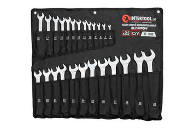 Набор ключей комбинированных 25ед. (чехол), 6-32мм представляет собой соединение рожкового и гаечного ключа. Обе стороны ключа имеют одинаковый размер головки. Идеальный вариант, когда необходимо совместиь силовую нагрузку и просто вращение. Разновидность размеров позволит подобрать наиболее удобный вариант в каждом конкретном случае. Изготовлены из высоколегированной хромванадиевой стали. Количество ключей в наборе: 25 ед.; Габаритные размеры: 650*570 мм; Размеры: 6-28, 30, 32 мм