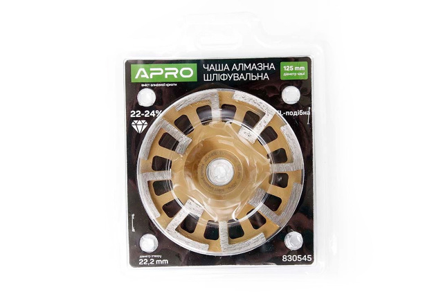 Чашка алмазная шлифовальная Apro - профессиональная алмазная чашка премиального качества для общего шлифования строительных материалов, таких как бетон, гранит, камень, кирпич. Специальные type алмазные сегменты увеличивают площадь шлифования на 50% а специальная облегченная геометрия корпуса делает работу легкой и эргономичной.