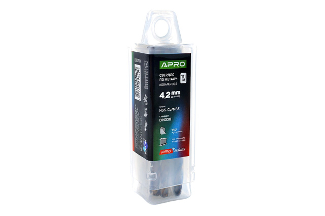 Сверло по металлу Apro – предназначено для сверления отверстий в металлических материалах, включая сталь, чугун, алюминий и другие сплавы. Диаметр сверла 4,2 мм. Тип стали: Кобальт Co/M35.