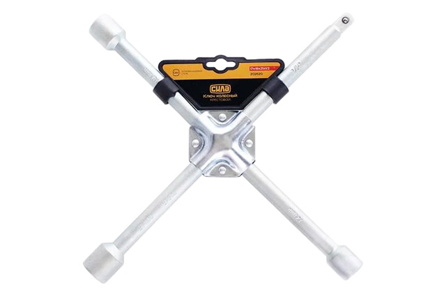 Баллонный крестовый ключ – удобный универсальный ключ для монтажа автомобильных колес. Наличие клепаной пластины на крестовине обеспечивает дополнительную прочность и долговечность конструкции ключа. Размеры головок: 17, 19, 21, 23 мм.