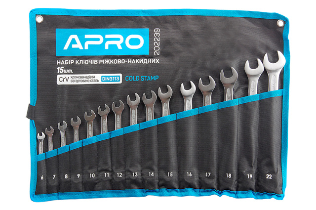 Набор рожково-накидных ключей Apro – отличный набор из 15 комбинированных ключей, каждый из которых представляет собой сочетание рожкового и накидного. Комбинированные ключи используются для монтажных, слесарных работ. Особенно широко они используются автослесарями. Ключи универсальны и практичны, позволяют работать с разными крепежными элементами – болтами, гайками и т.д. Количество ключей в наборе: 15 ед.; Размеры: 6-22 мм